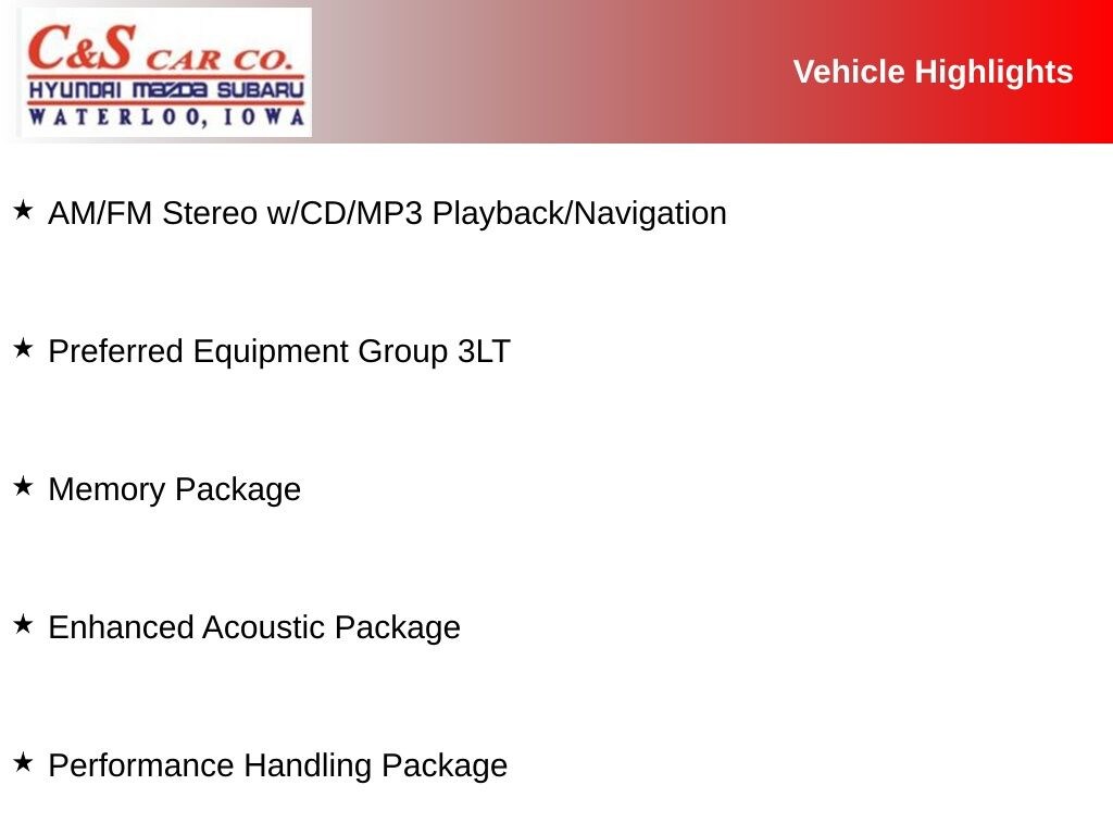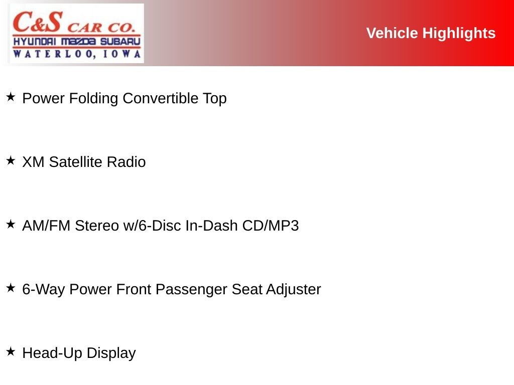 6-Way Power Front Passenger Seat Adjuster, AM/FM Stereo w/6-Disc In-Dash CD/MP3, AM/FM Stereo w/CD/MP3 Playback/Navigation, Body-Color Outside Heated Power-Adjustable Mirrors, Compass, Driver & Front Passenger Heated Seats, Driver & Passenger Frontal & Side-Impact Airbags, Enhanced Acoustic Package, Head-Up Display, Inside Rear-View Auto-Dimming Mirror w/Compass, Manual Tilt/Power Telescoping Steering Column, Memory Package, Performance Handling Package, Power Folding Convertible Top, Preferred Equipment Group 3LT, Rear Compartment Area Cargo Net, Steering Wheel Mounted Audio Controls, Stiffer Springs, Stiffer Stabilizer Bars, Universal Home Remote, XM Satellite Radio.
