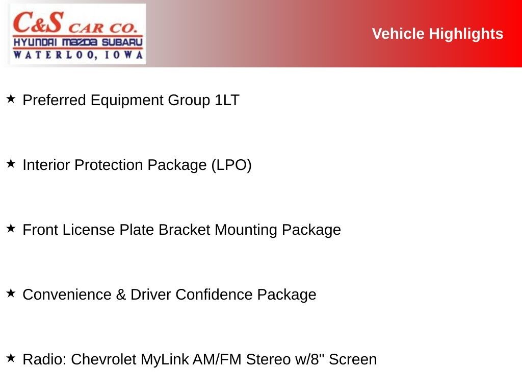 - Radio: Chevrolet MyLink AM/FM Stereo w/8" Screen