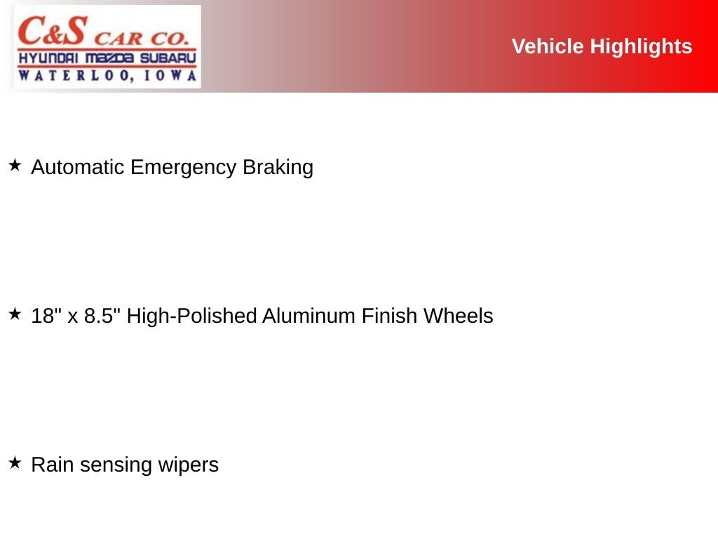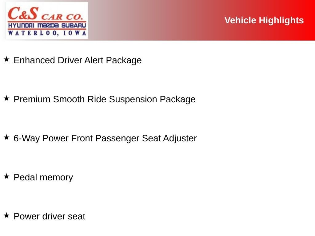 18" x 8.5" High-Polished Aluminum Finish Wheels, 6-Way Power Front Passenger Seat Adjuster, Automatic Emergency Braking, Enhanced Driver Alert Package, Forward Collision Alert, IntelliBeam w/Automatic High Beam On/Off, Lane Keep Assist w/Lane Departure Warning, Memory seat, Pedal memory, Power driver seat, Premium Smooth Ride Suspension Package, Rain sensing wipers, Safety Alert Seat.
