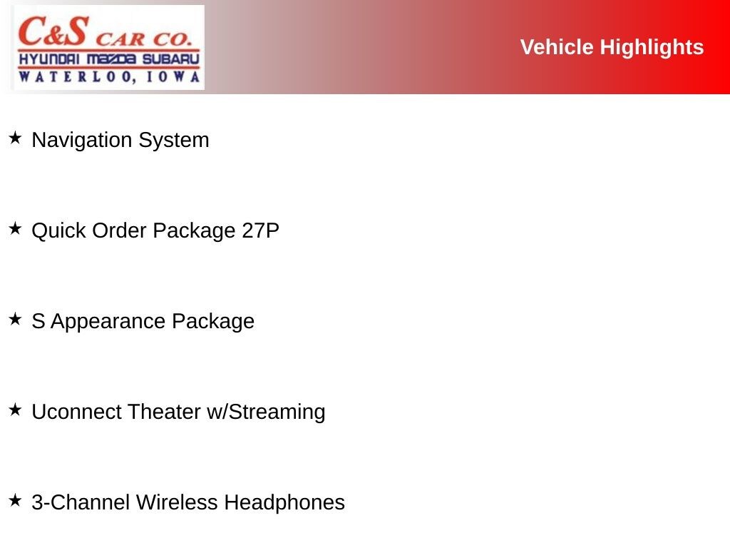 115V Auxiliary Power Outlet, 220 Amp Alternator, 3-Channel Video Remote Control, 3-Channel Wireless Headphones, Apple CarPlay/Android Auto, Black Badging, Black Chrysler Grille Wing Badge, Black Day Light Opening Moldings, Black Spear Applique - Rear Fascia, Black Stow N Place Roof Rack, Blu-Ray/DVD Player/USB Port, Body Color Door Handles, Body Color Exterior Mirrors, Falken Brand Tires, Front Bucket Seats, Heated front seats, Heated rear seats, High Definition Multimedia Interface, Memory seat, Nappa Leather Bucket Seats w/S Logo, Navigation System, Power driver seat, Power Liftgate, Power moonroof, Power passenger seat, Quick Order Package 27P, Reclining 3rd row seat, S Appearance Package, S Badge, Seatback Video Screens, Uconnect Theater w/Streaming, Upper/Lower Grilles/Blk Surrounds Premium Fascia, Ventilated Front Seats, Video USB Port, Wheels: 20" x 7.5" Aluminum Black Noise.