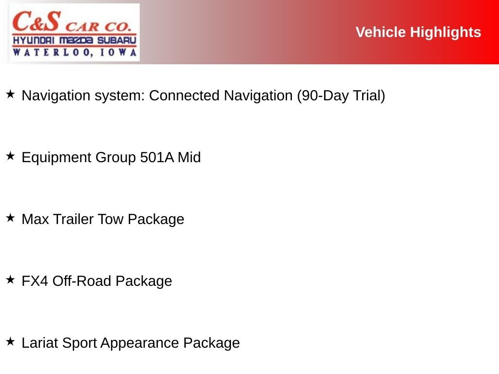 4x4 FX4 Off-Road Bodyside Decal, Accent-Color Angular Step Bars, Body-Color Front & Rear Bumpers, Box Side Decals, Chrome Single-Tip Exhaust, Class IV Trailer Hitch Receiver, Dark 2-Bar & 1 Minor Bar Style Grille, Equipment Group 501A Mid, Extended Range 36 Gallon Fuel Tank, FX4 Off-Road Package, Hill Descent Control, Integrated Trailer Brake Controller, Lariat Sport Appearance Package, Max Trailer Tow Package, Memory seat, Monotube Rear Shocks, Navigation system: Connected Navigation (90-Day Trial), Off-Road Tuned Front Shock Absorbers, Onboard 400W Outlet, Power driver seat, Power Tailgate, Pro Trailer Backup Assist, Radio: B&O Sound System by Bang & Olufsen, Rock Crawl Mode, Tray Style Floor Liner, Universal Garage Door Opener, Wheels: 18" 6-Spoke Machined Aluminum.