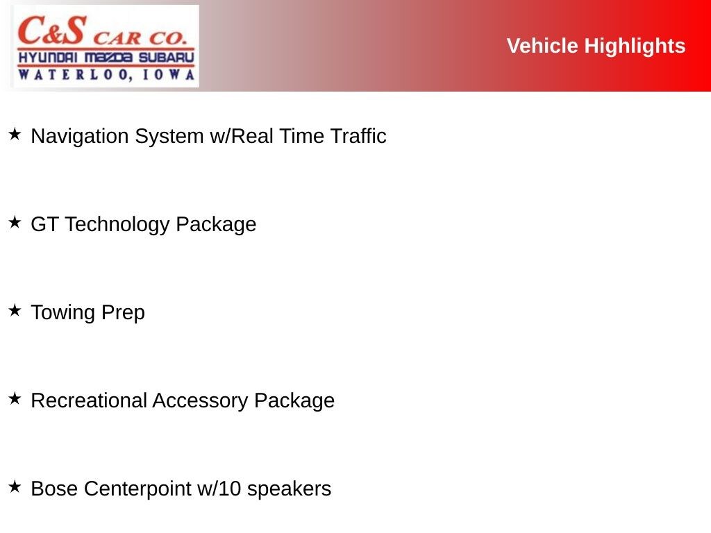 ⢠GT TECHNOLOGY PACKAGE: Includes Bose Centerpoint w/10 speakers, Recreational Accessory Package, Roof Rack w/Roof Rails, Cargo Netting, Rear Bumper Guard, Navigation System w/Real Time Traffic, Power Sliding Glass Moonroof w/Interior Sunshade, one-touch open/close, SiriusXM Satellite Radio, 4-month subscription