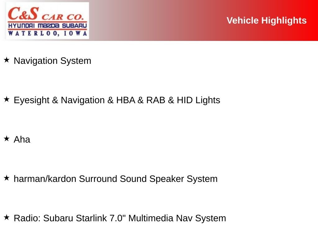 - Radio: Subaru Starlink 7.0" Multimedia Nav System