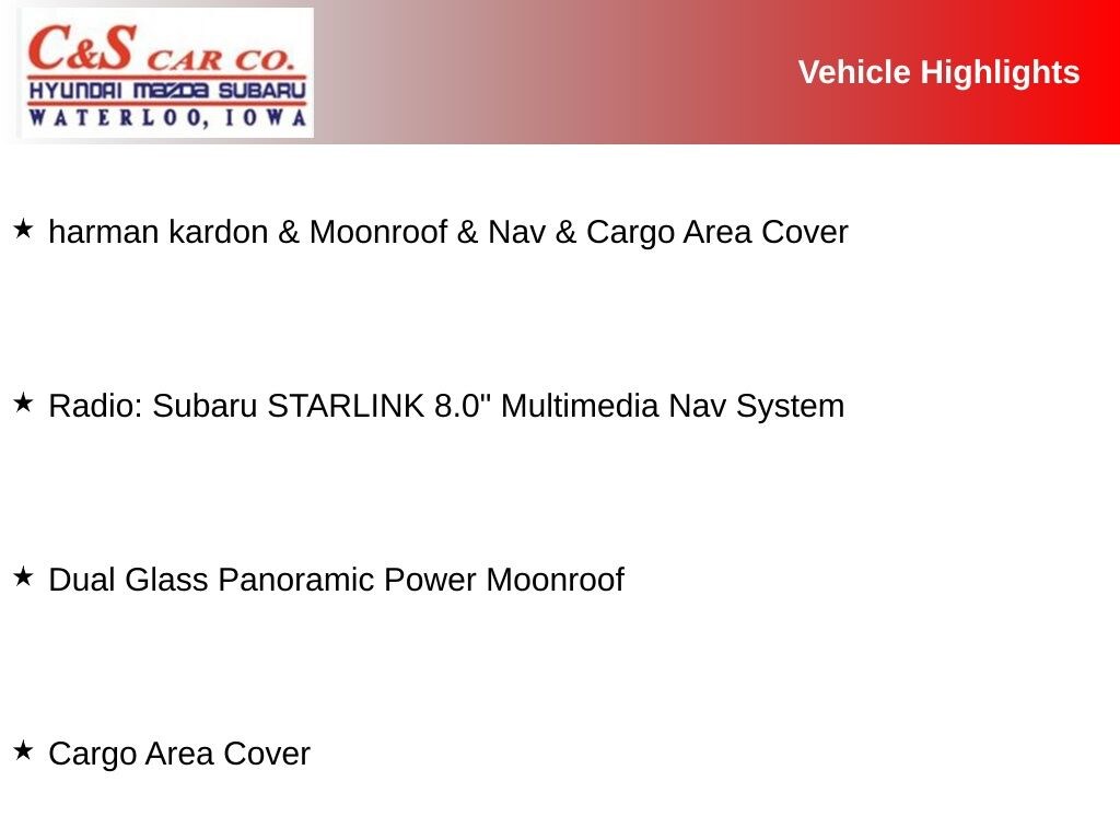 Cargo Area Cover, Dual Glass Panoramic Power Moonroof, harman kardon & Moonroof & Nav & Cargo Area Cover, Radio: Subaru STARLINK 8.0" Multimedia Nav System.