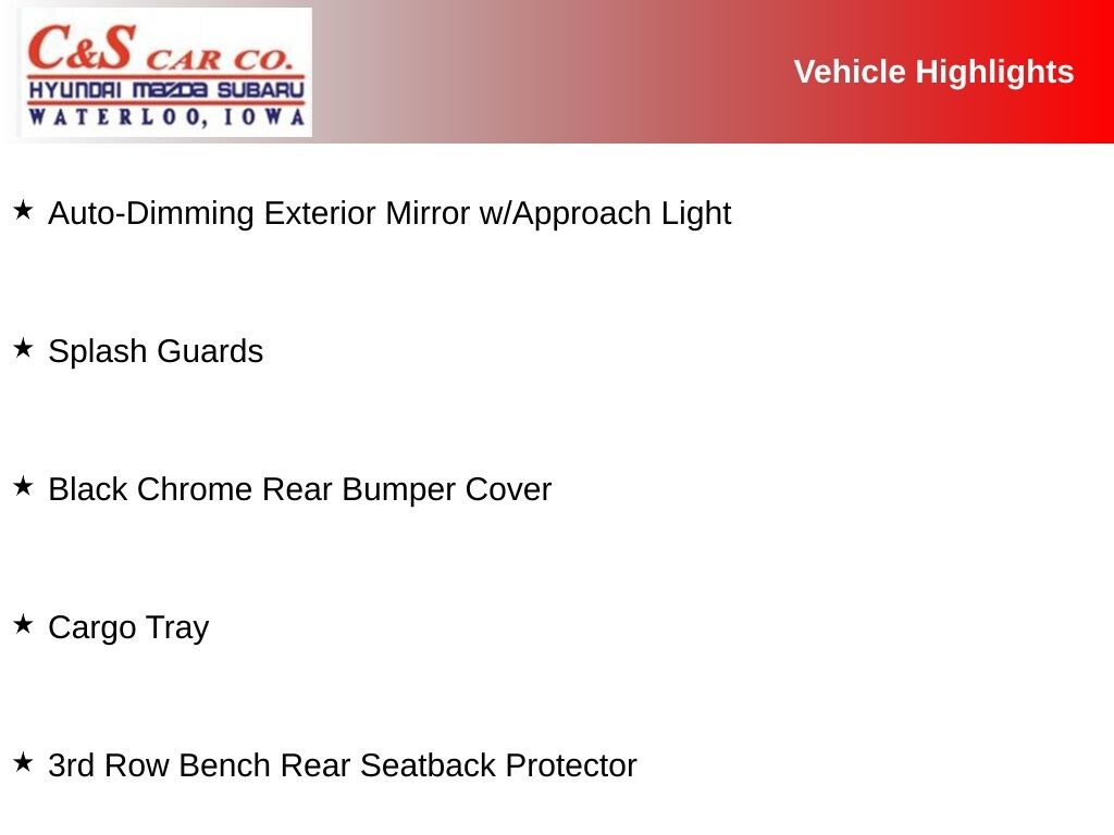 3rd Row Bench Rear Seatback Protector, Air Conditioning, All-Weather Floor Liners, Auto-Dimming Exterior Mirror w/Approach Light, Black Chrome Rear Bumper Cover, Cargo Tray, Heated Front Bucket Seats, Heated front seats, Heated rear seats, Heated steering wheel, HVAC memory, Illuminated entry, Leather Shift Knob, Map & Reading Lights LED Upgrade - 6 Bulb Kit, Memory seat, Navigation System, Popular Package - Onyx, Power driver seat, Power Liftgate, Power moonroof, Power passenger seat, Rear air conditioning, Reclining 3rd row seat, Splash Guards, Split folding rear seat, Standard Model, StarTex Upholstery, Wheels: 20" x 7.5 J Aluminum Alloy w/Black Finish.